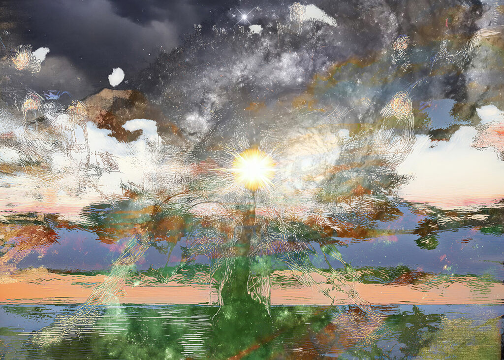 Almost Arcadia, 2011-2018, is a series of photo-montage, digital art works that explore the origins of manifest destiny and the control of nature that has led to climate change in the United States, referencing the consequences of colonization. Yet it also envisions the promise of a return to the embrace of an Arcadia universe of peace and reconciliation. The entire series along with text can be viewed in the Books section in the volume Photographs, 2013- 2022, on page 116. Click on this link: Photographs 2013-2022